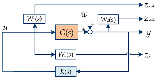 The multi-objective mixed robust controller model is shown in Figure 13. G(s) is the controlled object as shown in orange backgorund, w is the external interference signal, z∞1 and z∞2 are the output signal to evaluate H2 and H∞ performance, y is the measured output signal, u is the control signal, and K(s) in blue background is the controller to be designed. The robustness evaluation outputs W1(s), W2(s), and W3(s) are the weight functions of three evaluation outputs, respectively.