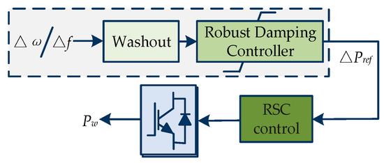 The designed mixed robust damping controller is configured in the RSC control, as indicated in Figure 16. The main goal of the control method is to decrease the unbalanced power by adjusting the wind power, which means the wind power could respond to the ultra-low-frequency oscillation of frequency with an electronic converter.
