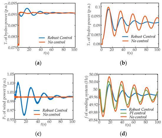 Under small disturbance conditions, when t = 2 s, the active power load of the sending system increases to 150 MW. To further compare the robust control with classical control, the PI control is conducted as well. The simulation results are given in Figure 17.