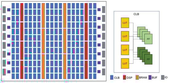 FPGAs are programmable logic chips with a dynamically configurable logic circuit structure that offers increased flexibility and customizability for diverse applications. Despite being manufactured by different vendors, FPGA chips share a similar architecture, differing only in minor local hardware configurations. Figure 1 provides a consolidated overview of the FPGA placement and routing architecture, including the configurable logic block (CLB), digital signal processor (DSP), block random access memory (BRAM), buffer (BUF), and I/O (IO) components. The right side of the figure also depicts the internal structure of the CLB, which consists of several basic logic elements (BLEs), where BLEs are composed of look-up tables (LUTs) and flip-flops (FFs).