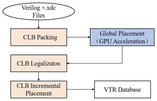 The proposed methodology is illustrated in Figure 3. Specifically, a dedicated parser device is crafted for handling input data in eblif format netlists. Leveraging the VTR netlist read function, this parser extracts essential graph information from the netlist, subsequently integrating it into the optimized DREAMPlaceFPGA framework based on the bookshelf format data. To achieve compatibility with the standard netlist data format, we introduced example additions and modified data interfaces during parsing. The overall workflow involves executing a global placement task using GPU acceleration and seamlessly importing the results into the VTR database. A pivotal aspect of our approach is the introduction of a CLB packing process, grounded in Edmond’s matching algorithm. This process was followed by the development of a CLB legalization process, informed by the outcomes of the packing strategy and global placement data. The results obtained from this comprehensive process serve as the initial state for our parsing method. Building upon this foundation, we employed a sophisticated parsing technique that not only reuses the placement results but also iteratively enhances them to yield refined CLB placement results. These results were then fed into the VTR router, completing the entire process. The proposed methodology integrates seamlessly into the design flow, optimizing the placement of CLBs within the FPGA architecture for enhanced performance and efficiency.