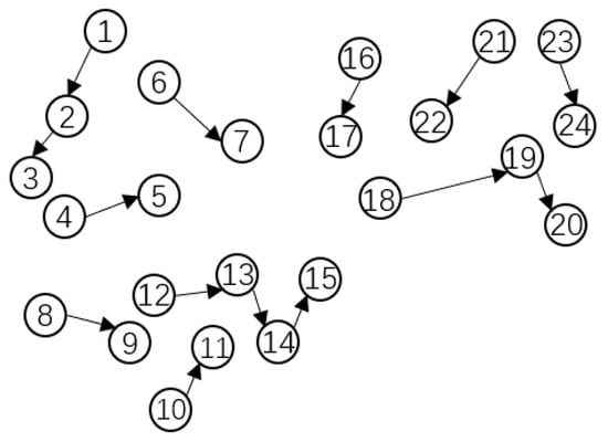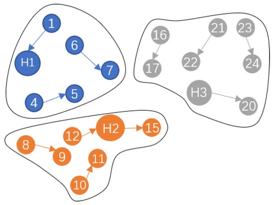 The VTR tool offers a comprehensive packing function based on a greedy algorithm and seed strategy, featuring intricate constraints to address considerations, making it well-suited for small-scale engineering scenarios. However, the current VTR packing and placement exhibit relative independence, particularly with the packing phase being time-consuming. This presents a significant opportunity for runtime optimization. To address this, our study focuses on refining the CLB merger generation strategy. We propose a CLB generation strategy based on Edmond matching, aiming to enhance the efficiency of the packing phase. The key adjustment involves conducting CLB clustering generation in strict accordance with logical relationships. By increasing the number of CLB clustering instances, we aim to not only improve packing time but also significantly increase the volume of placement tasks. The motivation behind this approach is to exploit GPU acceleration technology more effectively. This involves leveraging the parallel processing capabilities of GPUs to handle a larger number of placement tasks concurrently. Our strategy is illustrated in detail in Figure 4, Figure 5 and Figure 6. The LUT and FF graphs are established using information from the static timing analysis report (Figure 4 illustrates the initial state relationship of the node graph, encompassing nodes 1–24, utilizing a directed graph to represent time paths between cells with node weights calibrated by static timing results). Subsequently, the hypergraph of the register group is derived through the HCS (Highly Connected Subgraph) algorithm [29], as depicted in Figure 5, forming clustering points H1(2,3), H2(13,14), and H3(18,19). This newly formed hypergraph enables the calculation of the evaluation function and constraint function. The evaluation function, in this study, is expressed as the sum of weights, while the constraint function considers the number of cells accommodated within the CLB and the total number of CLBs. Employing the Edmond maximum weight matching algorithm [30], clustering results were obtained to ensure relative balance within each CLB block. Figure 6 illustrates the formation of division regions, with each region capable of independently performing CLB generation.