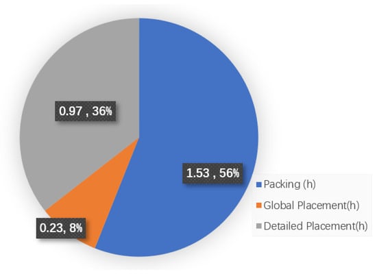 To underscore the versatility of the GPU acceleration framework in handling very large-scale netlisting circuits, we conducted a methodology validation using a million-gate scale System-on-Chip (SoC) netlisting, specifically BJUT-RISC [36]. Table 2 details the FPGA resource overhead statistics, with the utilization rate of LUTs exceeding 90%. Notably, the benchmarked BJUT-RISC faced challenges completing placement experiments on VTR due to memory constraints (limited to 36GB RAM on the experimental machine). In contrast, our proposed methodology not only accomplished the entire placement process but also capitalized on GPU acceleration, demonstrating its effectiveness in overcoming memory limitations. Figure 12 illustrates the runtime overhead statistics for benchmarking BJUT-RISC. The GPU-accelerated step consumes a mere 0.23 h, constituting only 8% of the overall process. This highlights the optimization impact achieved through GPU acceleration, with the detailed placement time of CLBs standing at a commendable 0.97 h.