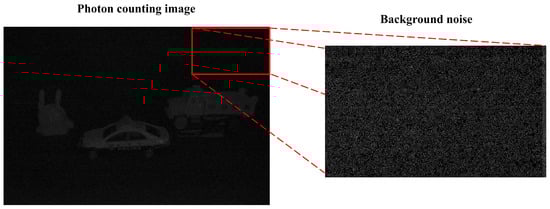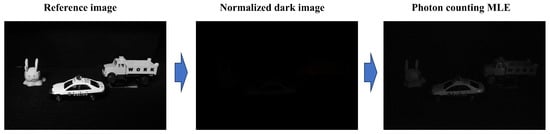 Figure 3 shows a noisy image from the background when the image is reconstructed by estimating photons with MAP. To visualize the noise, we increased the brightness by 40% and decreased the contrast by 40%. As shown in Figure 3, the MAP method can estimate photons more accurately than the MLE method to visualize the image under photon-starved conditions. However, since the MAP method applies a Poisson distribution to all areas, random noise occurs in the background. In this case, the noise in the background degrades the image quality of the object and makes it difficult to recognize the object accurately. In the next subsection, we propose a new photon-counting imaging technique to solve these problems.