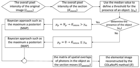 where R is the elemental image reconstructed by the COLaNoPS method; is the matrix of spatial overlaps of photons in the object as the section moves; and and is the section’s x and y-axis shifting pixel, respectively. Finally, the photon-counting imaging technique is applied only to the areas that are estimated to be objects; where photons overlap, the image can be reconstructed by applying the spatial overlapping.