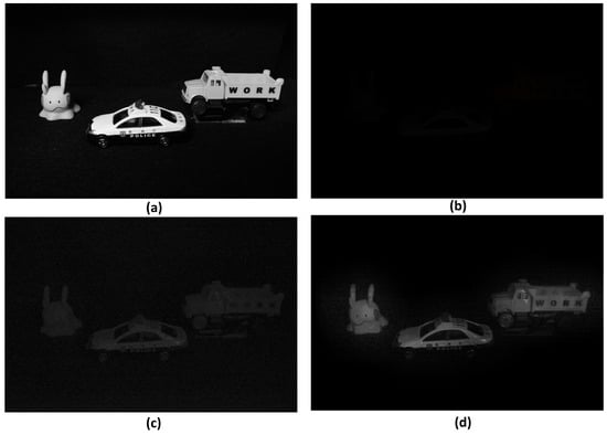 In this subsection, we show the results of the conventional method and the proposed method. Figure 7a is the image obtained under normal light conditions, and Figure 7b is the image obtained under photon-starved conditions. As shown in Figure 7b, the object cannot be visualized because it is too dark. Figure 7c is the reconstruction result by applying conventional photon-counting imaging techniques to the image in Figure 7b, which is not visible to the human eye. Figure 7d shows the reconstruction result by applying the COLaNoPS technique to the image in Figure 7b. For fair comparison, the number of photons applied to the images in Figure 7c and Figure 7d is 100,000. As a result, the reconstructed result by the conventional photon-counting imaging technique as shown in Figure 7c can visualize the object better than the image in Figure 7b, but it cannot accurately recognize the object due to the insufficient number of estimated photons. In contrast, the reconstruction result obtained using the COLaNoPS method as shown in Figure 7d can visualize the object better than the reconstruction result in Figure 7c, and the object can be visualized more clearly than the conventional photon-counting imaging technology when the same number of photons is estimated.