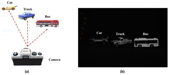 In this subsection, we describe the experimental setup to compare the conventional photon-counting imaging technique with the COLaNoPS method. Figure 6a shows the experimental setup in this paper. Figure 6b is the image obtained by the experimental setup. Photon-starved conditions are set by controlling the amount of light in this experiment. In this experiment, we use a Nikon D5300 to take experimental scenes because our proposed method is the computational algorithm with a general camera to implement photon-counting imaging technique as we mentioned earlier in the first section. All three objects are metal objects, and they are located at different distances from the camera. The distances from the camera to the objects are 400 mm, 430 mm, and 460 mm, with a distance difference of 30 mm for each object.
