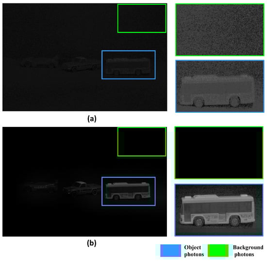 Figure 8 shows the background noise generated by the conventional photon-counting imaging method and the proposed method, and shows the improvement in the quality of the objects. In this experiment, we increase the brightness by 40% and decrease the contrast by 40% to visualize the background noise and object noise. Figure 8a is the result of the conventional photon-counting imaging technique. It shows the random noise in the background as the Poisson distribution is applied in all areas. Furthermore, objects cannot be accurately recognized when the number of estimated photons is insufficient. Figure 8b is the result of the COLaNoPS method. It shows that the background noise is also removed by applying the Poisson distribution only to the area where the object exists. Furthermore, by applying spatial overlap to the areas where photons overlap as the section moves, the object can be visualized more clearly and accurately than the result obtained using the conventional photon-counting imaging technique as shown in Figure 8a.