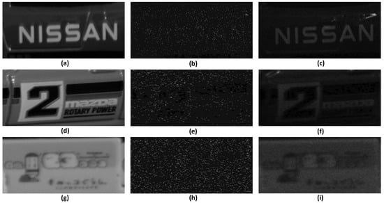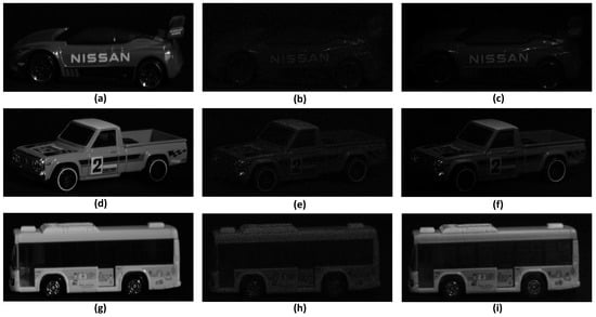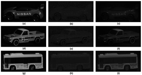 Figure 10 shows the result of increasing the number of photons by 1,100,000. Figure 10a,d,g show the reference image obtained under normal light conditions. The objects are listed in the order of car, truck, and bus, and all of them are identifiable. Figure 10b,e,h show the result of applying the conventional photon-counting imaging technology. The objects are listed in the order of car, truck, and bus, and it is difficult to identify them due to the lack of estimated photons, similar to Figure 9. Figure 10c,f,i show the result of applying the COLaNoPS method. The objects are listed in the same order and the objects can be recognized. As shown in the results of Figure 9 and Figure 10, we can see that, as the number of assumed photons increases, the photons for the object are more accurately estimated. As a result, our proposed method can reduce the background noise and visualize the letters or numbers on the surface of the object more accurately than the conventional photon-counting imaging technique.
