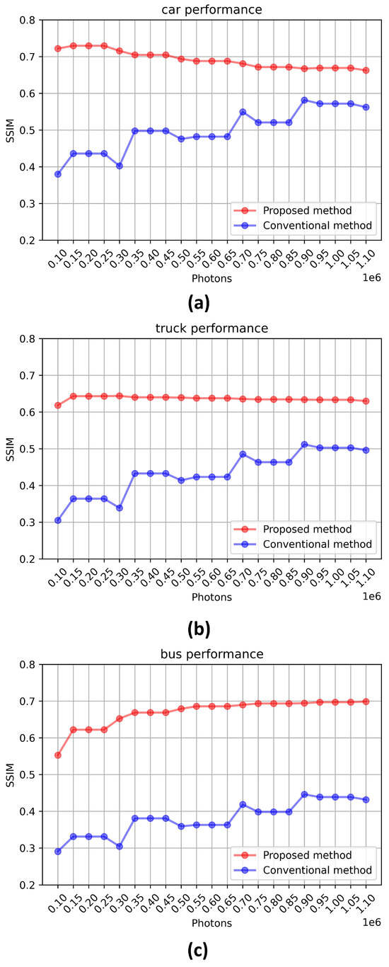 Although it is noticed that the proposed method can reconstruct the image under photon-starved conditions more accurately than the conventional method, the numerical comparison analysis may be required to verify our proposed method. In this paper, we use the structural similarity index measure (SSIM) metric for numerical comparison [27]. In SSIM analysis, we measured the change in SSIM as we incremented the photons from 100,000 to 1,100,000. Figure 11 shows the SSIM results for the conventional photon-counting imaging technique and the COLaNoPS method via various numbers of photons. Figure 11a shows the performance metrics of SSIM on car images. The average SSIM of the proposed method is 0.6917, while that of the conventional method is 0.4987, and there is a difference of about 1.387 times. Figure 11b shows the performance metrics of SSIM on truck images, where the average SSIM of the proposed method is 0.6363 and that of the existing method is 0.4336, and a difference of about 1.467 times. Figure 11c shows the performance metrics of SSIM for bus images, and the average SSIM of the proposed method is 0.6697, while that of the existing method is 0.3801, a difference of about 1.761 times. It can be seen that the SSIM value increases with the position of the object, because the closer the object is, the more photons can be estimated, so the image can be reconstructed clearly. However, photon-counting imaging cannot accurately estimate photons for dark objects, and dark objects are subject to frequent random noise. As a result, dark objects such as cars and trucks have a lower SSIM. As shown in Figure 11, the proposed method in this paper shows better SSIM results than the conventional method.