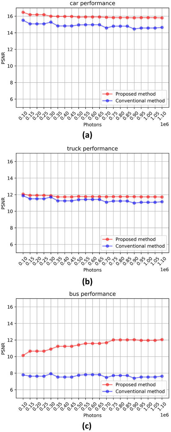 Figure 13 uses the peak signal-to-noise ratio (PSNR) [28] metric to compare numbers and letters on objects. In the PSNR analysis, we measured the change in PSNR when the number of photons increased from 100,000 to 1,100,000. Figure 13 shows the PSNR results of the conventional photon-counting imaging technique and the COLaNoPS method for different numbers of photons. Figure 13a shows the performance metric of PSNR for the image of letters on the car. The average PSNR of the proposed method is 15.94 and that of the conventional method is 14.85. Their difference is about 1.073 times. Figure 13b shows the performance metrics of PSNR for numbers or letters on the truck, where the average PSNR of the proposed method is 11.78 and that of the conventional method is 11.31. Their difference is about 1.041 times. Figure 13c shows the performance metrics of PSNR for characters on the bus, where the average PSNR of the proposed method is 11.44 and that of the traditional method is 7.647. Their difference is about 1.497 times. As shown in Figure 13, the proposed method in this paper shows better PSNR results than the traditional method.