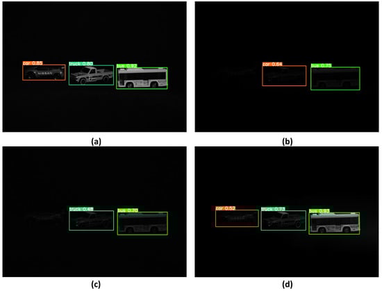 Figure 14 shows the object recognition rate by applying the YOLOv5 model [29] to the results of the conventional photon-counting imaging technology and the COLaNoPS method. Figure 14a shows the recognition rate of objects for the image obtained under normal light conditions, where all objects are correctly recognized with a high recognition rate. Figure 14b shows the object recognition rates for images obtained under photon-starved conditions. Only the bus object is correctly recognized, and the truck is incorrectly recognized as a car. Figure 14c shows the recognition rate of objects for the reconstructed image using the conventional photon-counting imaging technology. Only the truck and bus objects are recognized, and it shows that the recognition rate of the two objects is low. Figure 14d shows the recognition rate of objects for the image reconstructed using COLaNoPS technology. It can be seen that all objects, such as car, truck, and bus, are recognized more accurately, and the recognition rate is higher than that of the conventional photon-counting imaging technique.