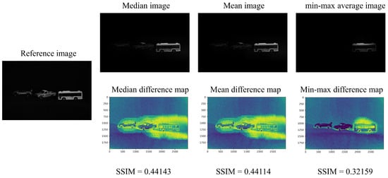 In this experiment, we have applied the median, mean value, and the average of the maximum and minimum values to define the threshold for determining the presence of an object, and found that the median value can accurately classify the object. Figure 15 shows the difference in SSIM among median, mean, and min-max average. The median and mean values can classify the objects correctly, and we can see that the SSIM for the median value is slightly higher than that for the mean value. The min-max average does not classify correctly, so only the bus is visualized. Furthermore, we can see that the min-max average has the lowest SSIM.
