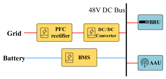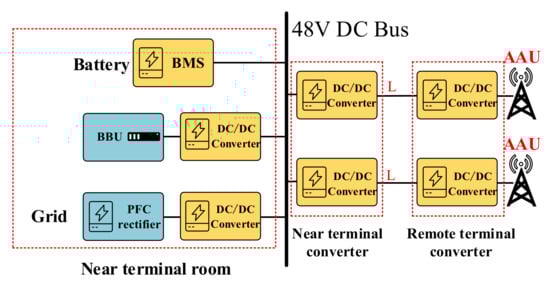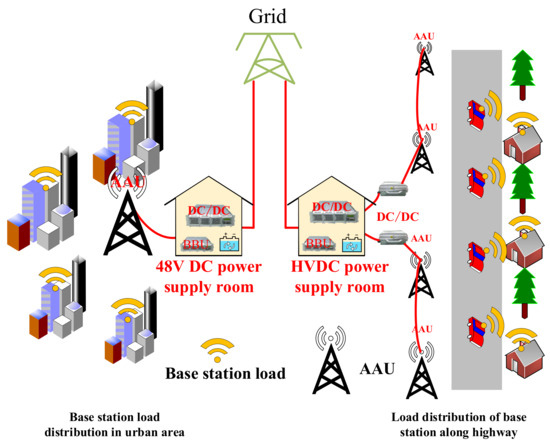 The all-area laying of 5G base stations is an important foundation for realizing the 5G communication strategy [1,2]. How to lay 5G base stations in all areas according to the load distribution characteristics of base stations in differentiated scenarios is a key step to realizing the 5G communication strategy. Figure 1 shows the basic distribution structure of base station load under two typical scenarios. Figure 1 shows the load distribution of the base station in the urban area on the left, which is characterized by relatively concentrated load and high density [3,4]. The installation and power supply of the active antenna unit (AAU) and base band unit (BBU) of the main equipment of the 5G base station are usually arranged nearby [5]. Figure 1 (the right) shows the distribution of base stations in the suburbs or along the highway [6,7,8,9]. Different from the load distribution of base stations in urban areas, the load of suburban or highway is highly dispersed, which often requires a long-distance power supply for communication equipment [10,11]. As shown in Figure 2, power factor correction (PFC) and battery management (BMS) are used to improve power factor and battery utilization, respectively. The common base station power supply system is powered by a 48 V DC bus, which is connected to the DC load and backup battery [12,13]. With the increase in power supply distance, 48 V low-voltage DC power supply will not only increase the cost but also cause problems such as excessive line voltage drop, which cannot meet the basic power supply requirements of communication equipment, and have adverse effects on efficiency and economy [14,15].