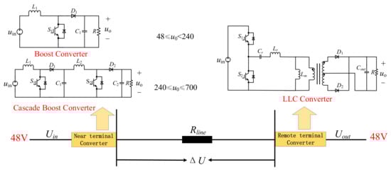 According to the power supply structure shown in Figure 3, the optimization of voltage level with the near terminal converter is studied. The system composition is shown in Figure 4. Due to the wide variety of converters with a high step-up ratio, this paper selects the most basic Boost and cascade Boost converters for analysis. The main reason is that these two converters have the basic characteristics of a wide step-up range, flexible design, and stable output voltage and have received extensive attention in the industry [30]. At the same time, considering that in the actual working process, the step-up ratio of the boost converter is limited by the parasitic parameters of the circuit and components [31,32,33], the step-up ratio here is set at 1–5 times. Therefore, the near-terminal converter is divided into two cases. When the output voltage of the near terminal is less than 240 V, a Boost circuit is selected. When the output voltage of the near terminal is greater than or equal to 240 V, two Boost converters are selected to work in cascade. To reduce the voltage, the more mature LLC converter in the communication power supply is selected.