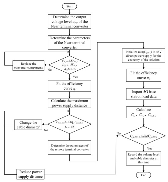 The optimization problem is solved using the traversal algorithm. Its basic solution process is shown in Figure 5. Firstly, determining the output voltage of the near terminal converter to determine the type of the near terminal converter. In order to ensure the normal operation of the converter, all components in the converter must work normally under the current voltage level. Therefore, if constraint conditions (19) and (20) are not met, the converter component type needs to be replaced. Secondly, the efficiency curve η1 of the near terminal converter is fitted according to Formulas (6)–(10) for the subsequent calculation of converter losses, and the maximum power supply distance is calculated under the current voltage level. Thirdly, we determined whether the cable diameter meets constraint conditions (18) and (21) at this time; if not, the cable diameter needs to be replaced. This step is to ensure that the electrical energy can be normally transmitted to the electrical equipment of the base station. Fourthly, min(CjLCC) is initialized as the economy of the 48 V direct power supply scheme, and the efficiency curve η2 of the remote terminal converter is fitted for the subsequent calculation of the loss in the remote terminal converter. Finally, CjLCC at this time is calculated to determine the size relationship between CjLCC and min(CjLCC). If the CjLCC is smaller, the voltage level and supply distance at this time are recorded, and the optimal matching scheme between voltage level and power supply distance can be obtained.