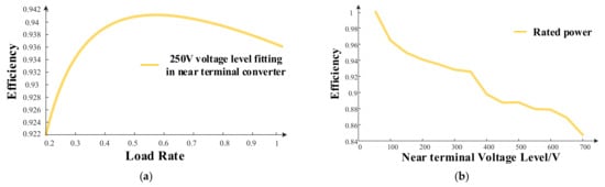 In order to match the power level of the current mainstream AAU equipment, the power of a single near terminal and remote terminal converter is set to 1500 W in this paper. On this basis, aiming at the voltage range of 48–700 V, this paper compares the schemes under 14 voltage levels with a 50 V step length. Based on considering the refined model of the converter, Figure 6a–d shows the fitting results and specific analysis of converter efficiency curves at different voltage levels and all converters operate at rated power.