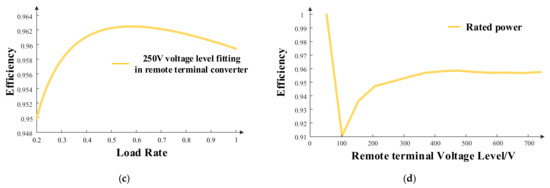 (a) Voltage level fitting of 250 V in the near terminal converter; (b) efficiency of the near terminal converter at different voltage levels. (c) Voltage level fitting of 250 V in remote terminal converter; (d) efficiency of the remote terminal converter at different voltage levels.