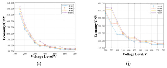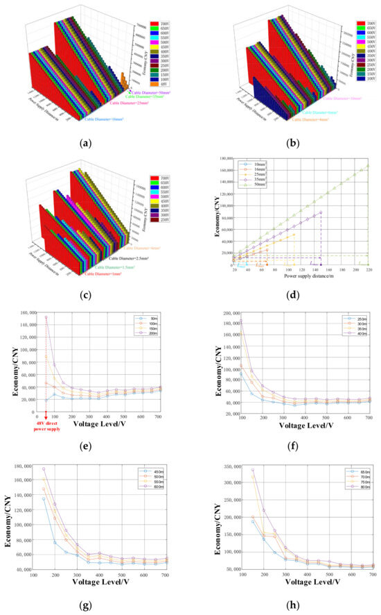 Figure 7a–c is an economic comparison of power supply schemes under different cable diameters. It can be seen from this figure that with the increase in voltage level, the available types of cables are expanded, and the power supply schemes tend to be diversified. Figure 7d shows the economic comparison of different cable types at different power supply distances under the 48 V direct power supply scenario. To obtain the optimal matching scheme between voltage level and power supply distance, the optimal economic curves corresponding to different voltage levels at the same supply distance are required, and the results are shown in Figure 7e–j.