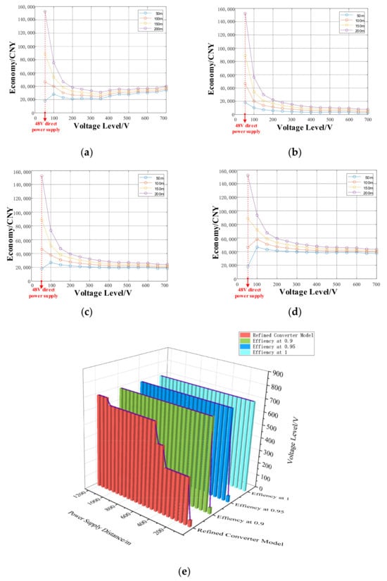 (a) Refined model for converter. (b) Converter efficiency is 100%, (c) Converter efficiency is 95%. (d) Converter efficiency is 90%. (e) Optimal matching scheme between voltage level and power supply distance for different models.