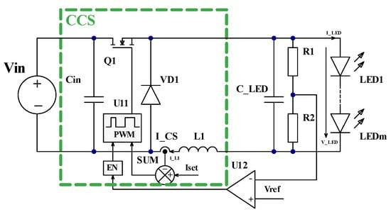 It is evidently seen from the circuit shown in Figure 1 that the overall efficiency of the SIMO CSM driver is noticeably lower in comparison with the bare buck converter in CCS mode as an additional CR conversion stage(s) is in use with its own controllable and uncontrollable switches and their power loss. The CCS stage current always flows through CR stages. To simplify the control system of the CR stage and the whole system (which is one of the main advantages of this configuration), uncontrolled diodes VD1 … VDk are used as top switches in CR stages. When the CR stage gives 100% light/current output, the whole current flows through this uncontrolled diode, causing high power loss, especially if there is a small number of connected LEDs in the regulated string.
