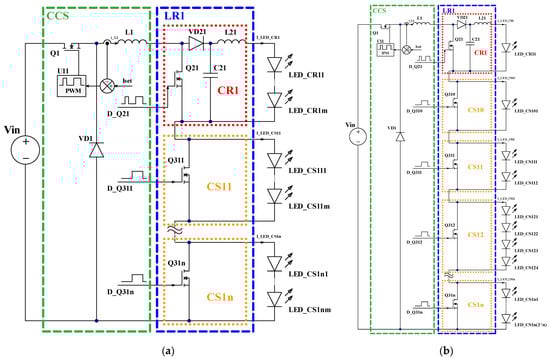 Implementation of light flux regulator LR in CSM SIMO LED driver: (a) using the same LED numbers in light flux regulator LRx and current switch CSxy branches; (b) using binary-weighted LED numbers in light flux regulator LRx and current switch CSxy branches.