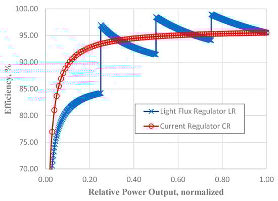 It is seen from these graphs that there is better efficiency of the LR stage at a higher output power and worse results in a low power range in comparison with the bare CR stage because only the CR part operates in LR at low light outputs. To achieve better efficiency of the lamp, the light output control strategy for LR can be constructed in such a way that the CR part is involved only in fluent transitions between different brightness states.
