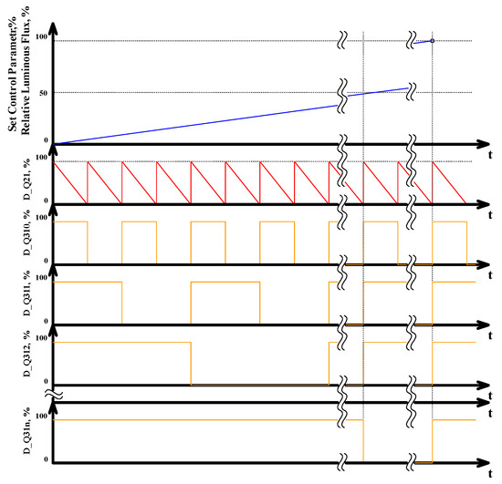 The total luminous flux produced by LEDs is approximately proportional to the given control parameter. Control signals of power switches Q21, Q310 … Q31n are formed in accordance with the specified value of the control parameter. CR’s power switch Q21 is driven by the signal D_Q21, the duty cycle of this signal varies within the range of 0 to 100%. The duty cycle of control signals D_Q310 … DQ31n for power switches Q310 … Q31n are either 0% or 100%.