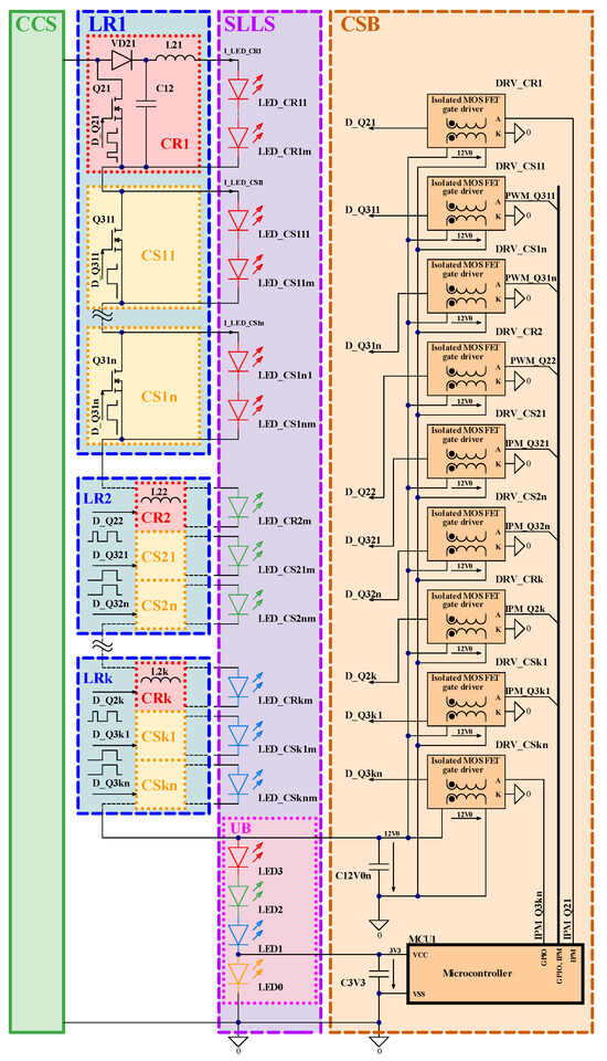 LEDs in the unregulated LED branch LED0 … LED3 of SLLS function as a voltage stabilizer for both the microcontroller MCU1 at 3V0 and the isolated MOSFET drivers DRV_CR1 … DRV_CRk, DRV_CS11 … DRV_CSkn of power switches Q21 … Q2k, Q311 … Q3kn at 12V0. For the optimization of transistor driving circuits, the UB of a segmented LED light source can be split and located at the CCS’ both negative and positive nodes as well, and both type N-FET and type P-FET transistors can be used in this case.