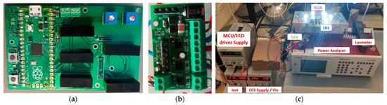 As the control system, the core of the proposed LR RP2040 microcontroller was selected. However, it could be any other microcontroller with enough configurable GPIOs: for this prototype, one PWM output and four GPOIs. For testing purposes, two control parameter input methods were implemented: (1) by trimmer and MCU readings of its set value on ADC input and (2) by “increase”/“decrease” push-buttons. A board of the control parts of the prototype is shown in Figure 9a.