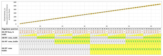The experimental validation of single LR stage luminous flux regulation is shown in Figure 10. The measurements were made with an indirect method using a luxmeter at the central point below the LED module. Correspondence of the control signals to the illuminance at the center point below the LED module at 1.1 m distance is shown here. The tests were conducted with the quite old (still in good condition), white, high-power LEDs available in the laboratory: Seoul Semiconductor W724C0 LEDs. The V–A and A–lm curves of a single LED of the mentioned type are given in [19]. The configuration of the module was made as shown in Figure 4b, except for the number of CS stages (three stages). The placement of LEDs is close to each other, but not perfectly symmetrical. Thus, the deviation of the experimental points across a linear interpolation is seen in Figure 10, close to the transition points when switching to the next CS combination state.
