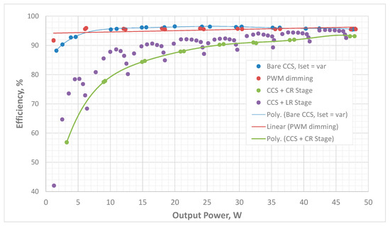 The assessment of the efficiency of the proposed system configuration is given in Figure 11. The tests for all dimming options were performed in similar conditions to the LED module mentioned above, with the maximum output power approximately 50 W using eight LEDs in total. Input voltage in all conducted experiments was the same, 35 V. The data obtained using Newtons4th Ltd. (Leicester, UK) PPA5530 precision power analyzer were used for this experimental efficiency validation. It is seen here that the efficiency of the bare CCS part is noticeably better in comparison with the combination of CCS+CR, which is the price for using such a kind of SIMO driver in high-power applications. However, as can be seen from Figure 11, some efficiency improvements can be achieved using the proposed configuration with light regulator stages.