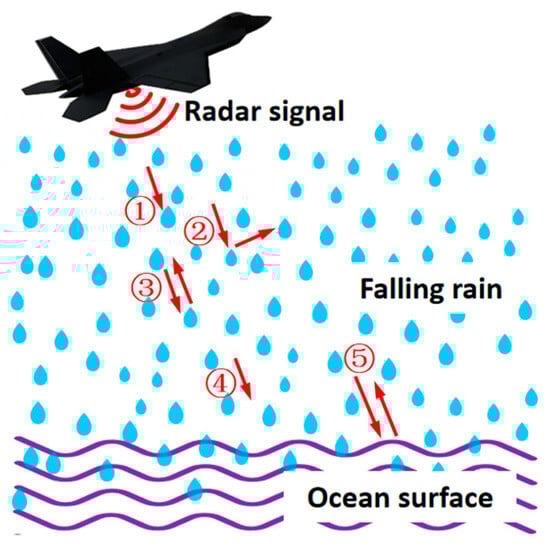 In this study, we focus our theoretical investigations on radar signals at frequencies of 3, 5, and 9 GHz. Based on the schematic representation depicted in Figure 1, the theoretical model is constructed by segmenting it into five fundamental components, each playing a distinct role in shaping radar signal propagation: (1) absorption, which can be caused by various factors, including the composition of the atmosphere or water, and it results in a decrease in the energy of the radar signal; (2) scattering, which occurs when the radar wave encounters raindrop particles that affect the direction and intensity of the radar signal; (3) backscattering induced by falling rain; (4) gaseous absorption, referring to the radar signal being absorbed by gases in the atmosphere; (5) backscattering arising from interactions with the ocean surface, which is influenced by factors like the sea state (e.g., wave height and wave direction), surface winds, and the surface roughness of the ocean. This component is particularly important in marine radar systems for navigation and oceanographic studies.