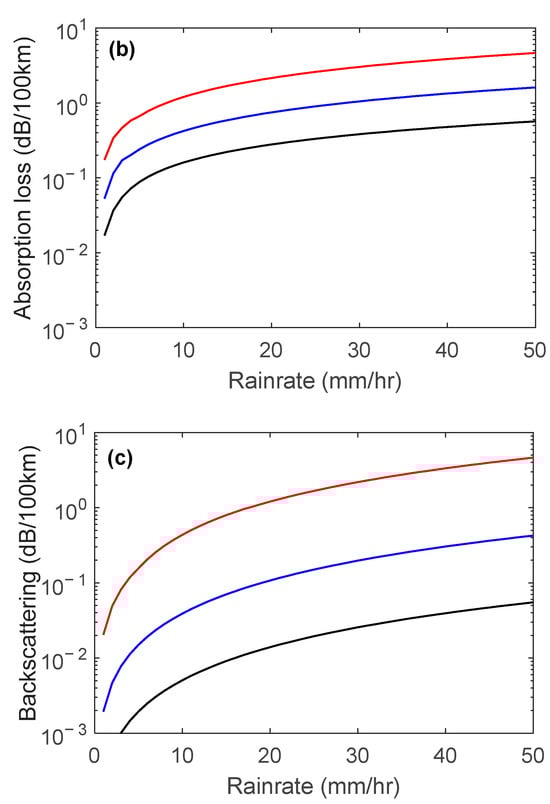 Degradation of radar signal due to falling rain in Mashall–Palmer drop size distribution. (a) Scattering loss, (b) absorption loss, and (c) backscattering by rain droplets. Plot (b) and (c) keep the same legend as plot (a).