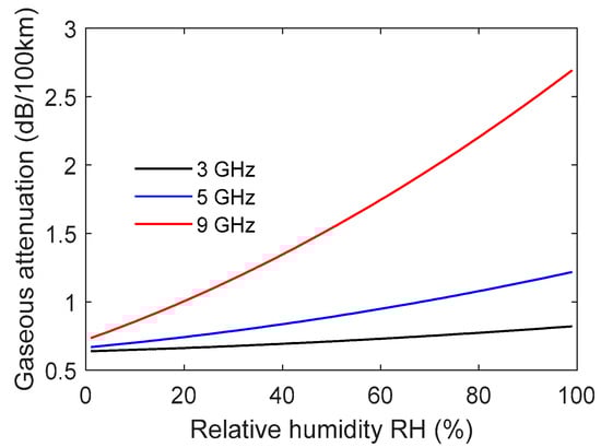 We calculate gaseous attenuation concerning relative humidity under standard pressure (1013 mbar) and temperature (20 °C) conditions, representing typical outdoor conditions. Our results, as illustrated in Figure 3, indicate that gaseous attenuation becomes particularly severe for 9 GHz signals when the relative humidity exceeds 20%. This significant finding highlights that as operating frequencies increase, the role of gaseous attenuation becomes increasingly critical, dominating the limitations on long-distance signal transmission. This effect is especially pronounced in the terahertz frequency range, where higher frequencies interact more intensely with atmospheric gases [].