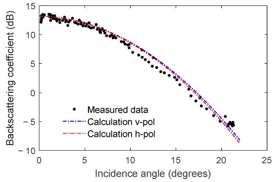 To adapt the IEM model to our specific conditions, we introduce an expression for root mean square (rms) height as , where v symbolizes wind speed. The parameters w0 and w1 assume empirical values tailored to the particular ocean surface under consideration. Figure 4 presents our estimation of the backscattering coefficient for a 9.6 GHz radar signal, with a correlation length (l) set at l = 16 cm. Notably, the backscattering coefficient significantly diminishes with larger incidence angles for both vertical (v-) and horizontal (h-) polarizations. Our calculations align closely with measured data obtained from a 9.6 GHz ER-2 Doppler Radar (EDOP) operating over the ocean surface in the southern Florida offshore region [] with wind speed v = 3 m/s and parameters w0 = 0.0009, w1 = 0.0276. This agreement highlights the efficacy of the IEM model in predicting ocean surface backscattering, outperforming the modified Fresnel reflection equation proposed in [].
