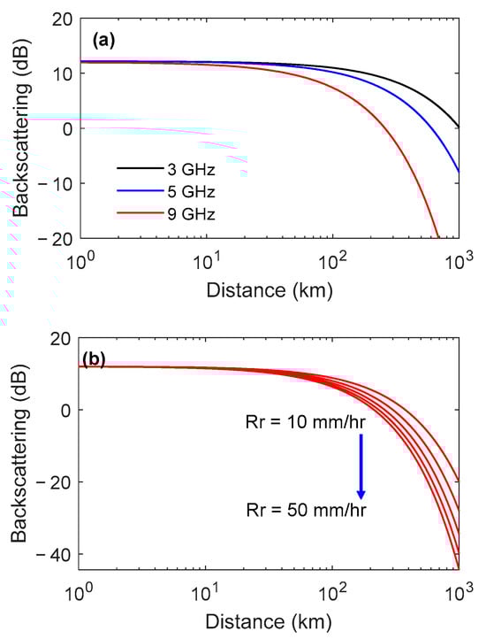 Shifting our focus to the influence of falling rain on radar signal propagation, we quantify this factor by rainrate, represented as Rr. Figure 5b illustrates the impact of varying rainrates on radar signal propagation in a clear and quantifiable manner. While the influence of rainrate is discernible, its effects appear less pronounced when compared to the dominant role played by gaseous absorption. However, our comprehensive analysis demonstrates that rain-induced effects become increasingly prominent with higher rainrates, a finding that has been validated by measured data using a C band ASAR radar []. This observation underscores the importance of considering the interplay of factors, including rainrate, in radar modeling, particularly in regions characterized by heavy rainfall. The data reveal that radar backscattering tends to decrease with an increase in rainrate, a phenomenon that can be attributed to the growing absorption loss induced by falling rain, rather than solely to the physical changes on the water surface in rain fields, as previously assumed [].