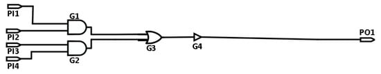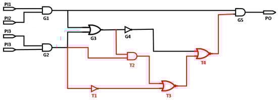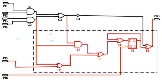 After the implant node search, we obtained the suspicious nodes (possibly HT nodes). Then, the intersection between the suspicious node and all the nodes of the MSOS detected in step (1) of Figure 6 was computed. At this point, we obtained the HT node set. It is necessary to know that if the target netlist is detected to contain HTs, then the nodes additionally implanted relative to the golden netlist must inherently contain nodes of the HTs. Therefore, the method described in this article searched for the nodes implanted in the target netlist relative to the golden netlist, and it then intersected them with the nodes in the MSOS. This process can avoid the requirement for further HT validation. Figure 9 presents an example of a netlist circuit diagram with a GLHT implanted. In particular, the red color represents the HT nodes obtained after the intersection.