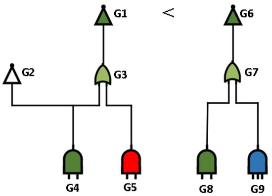 Figure 8 compares the nodes corresponding to the G1 and G6 units according to Algorithm 2. The nodes that have been compared in this figure are colored: green represents the same, while red or blue represents those that are different. It can be seen that, according to the breadth-first rule, when comparing the nodes corresponding to the G5 and G9 units, the nodes corresponding to the G1 unit were smaller because the former had a smaller number of input nodes.