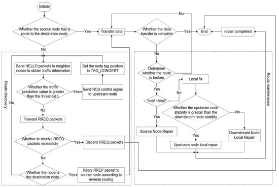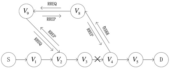 As shown in Figure 4, the link between node and node is broken; hence, data packets will not traverse the route from to . When the stability of node is higher than that of node , the upstream node initiates a local repair. At this moment, node is searching for the next two-hop nodes in its routing table, specifically . As long as a route from to is identified, the route can be restored. Node sends an RREQ packet to through its neighbor node . After receiving the RREQ packet, node replies with an RREP packet to . If node receives the RREP, it means that the local route repair is completed. The repaired path is: . The repair path in Figure 4 is just one example; the route repair may also involve a route through node .