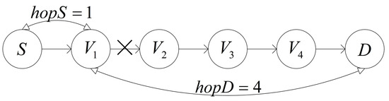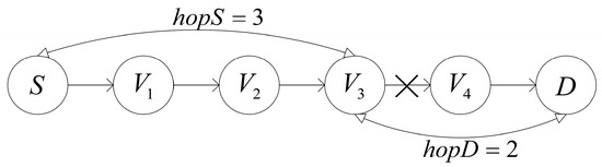 As shown in Figure 2, when , the source node repair is used for route repair at the fracture point. At this point, the fracture location is relatively close to the source node, and using source node repair can quickly establish the optimal path. This repair method can reduce the increased latency caused by complex local repair judgments and reduce routing overhead.