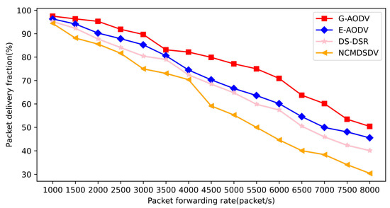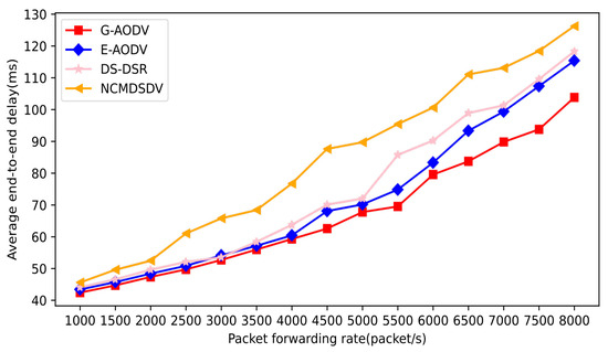 As shown in Figure 7, as the packet forwarding rate increases to a certain level, the network may become congested. This means that the router starts receiving more packets, causing packets to be queued and waiting to be sent, thus increasing transmission latency. When congestion occurs, average latency increases significantly. Therefore, for these four protocols, the average end-to-end delay shows an upward trend. The G-AODV protocol not only considers the number of hops during the route establishment process, but also considers the load status information of the node. This protocol uses a forwarding control mechanism to prevent excessive data traffic from being directed to heavily loaded nodes, thereby alleviating the problem of increased latency caused by heavy loads. At the same time, the heavily loaded nodes get a certain amount of time to relieve their heavy load status, ensuring the smooth flow of the entire network. Considering the unstable connection of satellite links, the G-AODV protocol adopts a dual repair mechanism in the routing maintenance phase. This mechanism adjusts routing to quickly restore broken paths and avoid communication interruptions. Compared with E-AODV, DS-DSR, and NCMDSDV, the average end-to-end delay of G-AODV has been reduced.