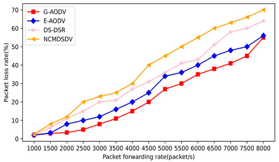 As shown in Figure 8, when the packet forwarding rate is low, the network is relatively idle and can effectively process and transmit data packets, so the packet loss rate is low. As the packet forwarding rate increases, the network begins to be congested, resulting in an increasing packet loss rate. Therefore, as the packet delivery rate increases, the packet loss rate curves of the four strategies all show a linear upward trend. When the packet loss rate is high, it indicates that the network has exceeded its processing capacity and cannot effectively handle all incoming packets. It can be seen that the G-AODV strategy in the figure has the lowest packet loss rate, which is due to its ability to predict the future load status of the node. When a node may be in a heavily loaded state, the node sends a congestion signal to the upstream node, and the upstream node directs traffic to a lighter loaded node. This ensures that in a network environment with a large packet delivery rate, the node can adjust its own load status so that the data packet can find a smooth route to the destination node. Even after the link is broken, the node can adopt a maintenance mechanism to repair the route and ensure the link connection. This strategy controls the increase in packet loss rate to a certain extent. The simulation results show that as the packet forwarding rate increases, the packet loss rate of G-AODV is significantly lower than the comparison routing strategy. Compared with E-AODV, DS-DSR, and NCMDSDV, the packet loss rate of G-AODV is reduced by 5%, 19%, and 22%, respectively.