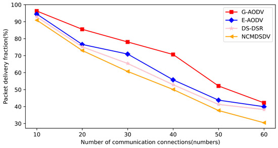 As shown in Figure 9, as the number of communication connection pairs increases, it means that more data traffic is injected into the network. Therefore, the load on the network is further increased, resulting in packet loss and ultimately a decrease in the packet delivery rate of the routing protocol. G-AODV introduces a traffic prediction mechanism in the route discovery phase to predict congested nodes to the maximum extent. This avoids the addition of heavily loaded nodes, and the established routing path will not suffer from local overloading or massive packet loss. Compared with E-AODV, DS-DSR, and NCMDSDV, the packet delivery rate of G-AODV has increased by 15%, 18%, and 20%, respectively.