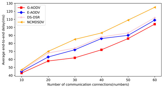 As shown in Figure 10, as the number of communication connection pairs increases, the network load increases, so the average end-to-end delay of all routing protocols continues to increase. The G-AODV protocol selects the path with lighter load and aims to achieve load balancing. In a load-balanced network, network resources are allocated and managed efficiently to ensure that no node is overloaded. This means that the network can cope better with the load even as the number of communication connection pairs increases. Therefore, increasing the number of communication connections will introduce some additional delays, but these delays will be limited by effective load balancing. At the same time, the G-AODV protocol can quickly restore broken paths during the routing maintenance phase to ensure smooth communication. Compared with E-AODV, DS-DSR, and NCMDSDV, the average end-to-end delay of G-AODV has been reduced.