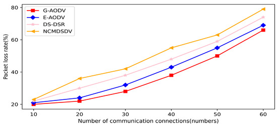 As shown in Figure 11, when the number of communication connection pairs increases, the large number of connections may introduce more signal interference and link quality fluctuations. As a result, the probability of link failure in the network increases, eventually leading to the loss of data packets. Additionally, when the number of connections increases rapidly, data traffic increases and the network may struggle to cope, resulting in packet loss. On the basis of achieving load balancing, G-AODV provides a solution when the link is broken, that is, the route maintenance mechanism. After the link is broken, the route maintenance mechanism is immediately adopted to ensure the link connection, which controls the increase in packet loss rate to a certain extent. G-AODV uses node stability to select different satellite nodes for link repair, which can effectively prevent the increase in packet loss rate caused by secondary link breaks. The simulation results show that as the number of communication connection pairs increases, the packet loss rate of G-AODV is significantly lower than that of the comparative routing strategy. Compared with E-AODV, DS-DSR, and NCMDSDV, the packet loss rate of G-AODV is reduced by 4%, 10%, and 18%, respectively.