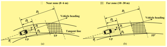 The choice of the values of and needs to be specially explained here. The near point is defined as a close distance at which the driver can see the road through the front windshield; the specific far zone defined in our study was determined by referring to the relevant literature on the preview time [32,36], as well as according to the road curvature.