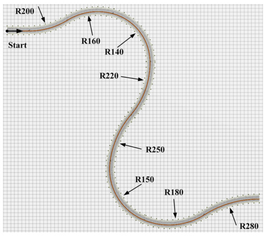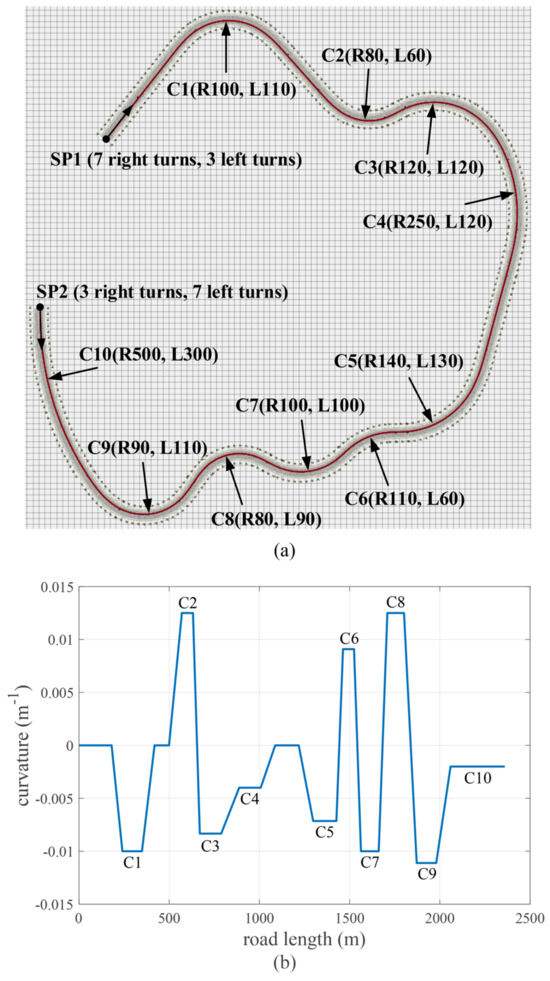 The experiments were conducted on a curved four-lane road in a horizontal plane. The width of each lane was 3.5 m. The test road was in total 2359.5 m in length, and road curvature changed continuously. It was built based on PreScan and linked by “straight road”, “spiral road”, and “bend road” segments (note that “straight road”, “spiral road”, and “bend road” are the terms of three types of road segments in the PreScan software). Among them, there were ten various circular curves with a radius from 80 m to 500 m. The details of each circular curve are shown in Figure 7. When taking SP1 as the start point, there were 7 right turns and 3 left turns; when starting from SP2, there were 3 right turns and 7 left turns.