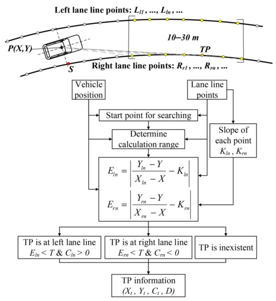 - If (a threshold value) and , the TP is the point satisfying ; if and , the TP is the point satisfying ; the coordinates of the TP , the curvature at the TP , as well as the distance between the TP and the vehicle can be obtained; if not, specify , , , and .