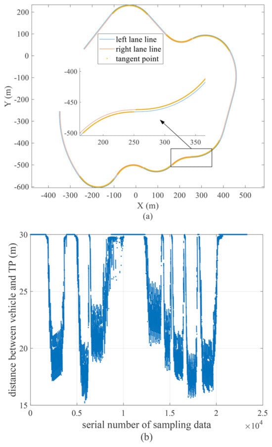 The TP information of one driving process is shown in Figure 9. As can be seen from Figure 9a, the tangent points (limited within 30 m ahead of the vehicle) were mainly located on the curved road with a big curvature. This also provides an intuitive understanding about which parts of the curved road the TP or FP information are respectively used as the inputs for the steering decision. In addition, analyzing the road curvature of Figure 7b, Figure 9b shows the value with the change of road curvature. We can clearly observe that the distance from the vehicle and TP decreases with the increase of the road curvature. Accordingly, the result suggests that the parameters related to the tangent point may reflect and present some road information in the driving process.